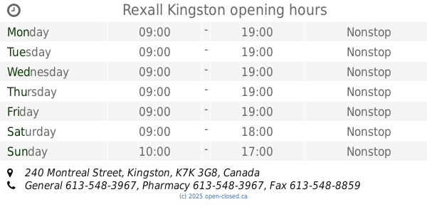 It is also possible to : Edit these OPENING HOURS of Store Rexall In Kingston, 240 Montreal Street,